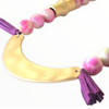 Collar corto con una espectaculares lágrimas de ágatas facetadas burdeos, howlite turquesa y zamak con baño de oro mate. Este collar tiene una preciosa pieza central de un medallón con flor que seguro conseguirán resaltar tu look favorito.