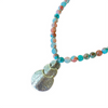 Collar corto con cuentas de ágatas facetadas topo con cuentas de Howlite turquesa. El collar tiene 2 discos laterales de zamak patinado azul y un espectacular aro de zamak con patina azul. Combínalo con tu look look favorito!