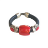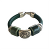 Elegante pulsera de cuero regaliz tostado, con cuentas de Zamak con baño de oro y espectaculares cuentas de cerámica Azules. Combínala con tus prendas de diario.